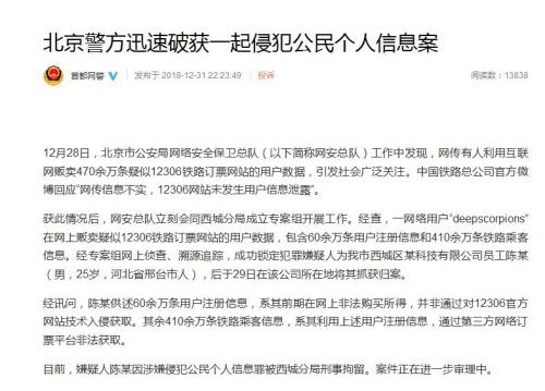 據(jù)北京市公安局網(wǎng)絡(luò)安全保衛(wèi)總隊(duì)微博消息,北京警方破獲一起侵犯公民個(gè)人信息案,網(wǎng)上販賣(mài)470余萬(wàn)條疑似12306鐵路訂票網(wǎng)站用戶數(shù)據(jù)的犯罪嫌疑人陳某,已被刑拘。