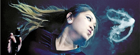 圖為2017年在俄羅斯莫斯科市舉行的專業(yè)電子煙產(chǎn)業(yè)展銷會(huì)。玩家正手持電子煙吐煙圈。新華社資料照片