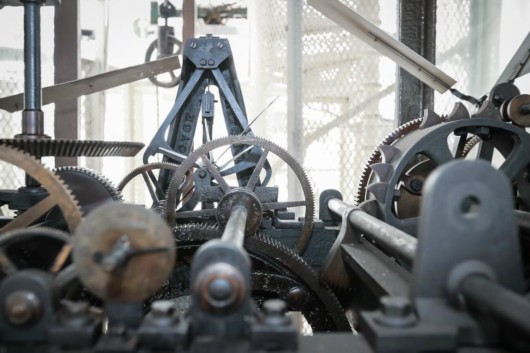 大鐘機(jī)芯內(nèi),大量齒輪互相咬合,直徑超過12毫米的鋼絲繩代替了普通鐘表中精細(xì)的鋼絲。(海沙爾 攝)