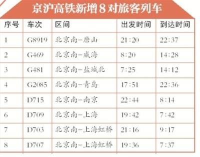 記者從北京鐵路局獲悉,調(diào)圖后,京滬高鐵將增加8對旅客列車,分別為北京南至唐山、威海、鹽城北、青島、南京、上海各1對,至上海虹橋動車組2對。