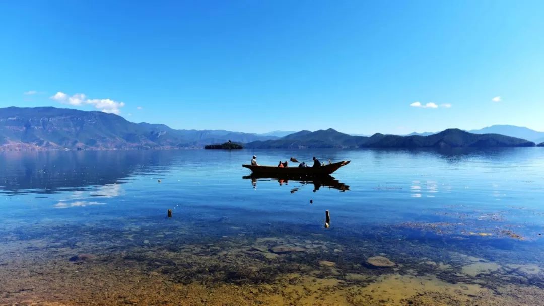 2018-11-02,云南瀘沽湖。藍(lán)天白云,小船悠悠。作者:遠(yuǎn)行客