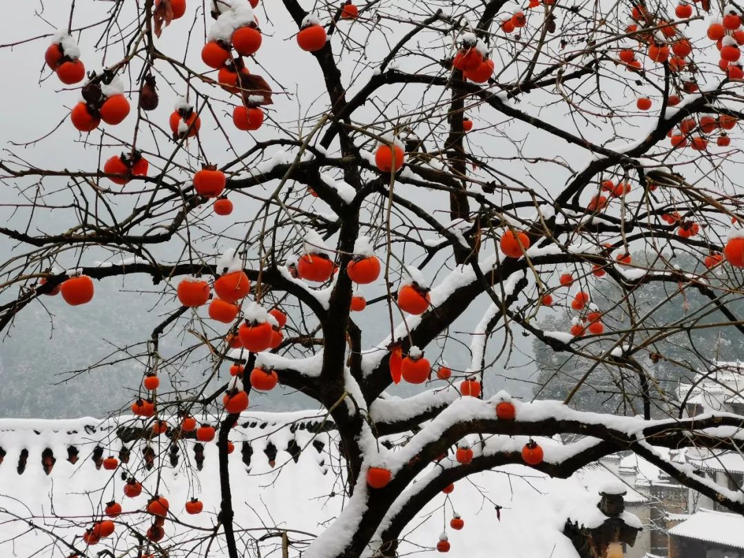 2018-12-31,江西婺源。在中國(guó)最美鄉(xiāng)村婺源,古村落篁嶺喜降瑞雪,滿(mǎn)樹(shù)的柿子如一個(gè)個(gè)小燈籠,紅紅火火,喜迎新年。作者:董立新