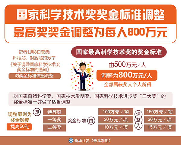 新華社北京1月8日電(記者胡喆、荊淮僑)國家最高科學(xué)技術(shù)獎的獎金標(biāo)準(zhǔn)由500萬元/人調(diào)整為800萬元/人,全部屬獲獎人個人所得……記者8日獲悉,科技部、財(cái)政部印發(fā)了《關(guān)于調(diào)整國家科學(xué)技術(shù)獎獎金標(biāo)準(zhǔn)的通知》,對獎金標(biāo)準(zhǔn)做出調(diào)整。