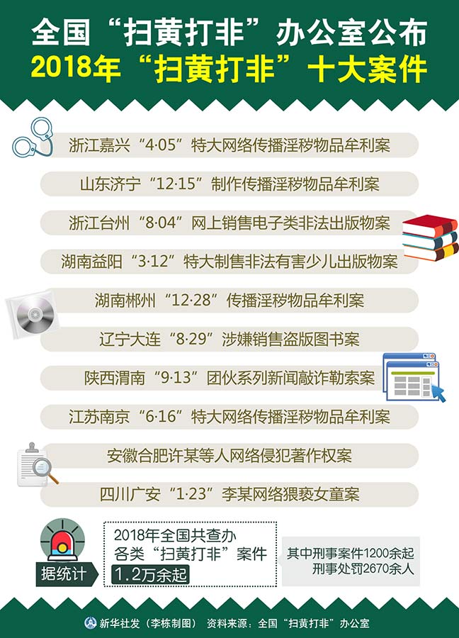 圖表:全國“掃黃打非”辦公室公布2018年“掃黃打非”十大案件 新華社發(fā) 李棟 制圖
