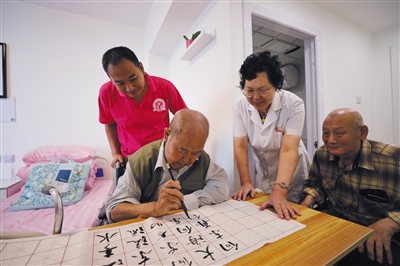 去年9月12日,安貞街道安華怡園養(yǎng)老照料中心開門迎客,入住老人在房間里練習(xí)書法。資料圖片/記者 王飛 攝