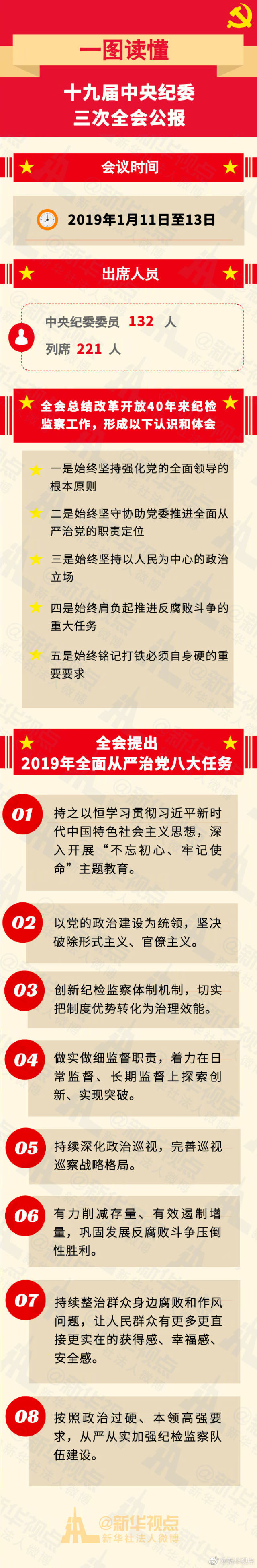 【一圖讀懂十九屆中央紀(jì)委三次全會(huì)公報(bào)】為期3天的十九屆中央紀(jì)委三次全會(huì)13日在北京閉幕。新華社受權(quán)發(fā)布了全會(huì)公報(bào)。此次中央紀(jì)委全會(huì)取得了哪些重要成果?對(duì)2019年全面從嚴(yán)治黨、黨風(fēng)廉政建設(shè)和反腐敗斗爭(zhēng)又有哪些新的部署?詳情戳圖