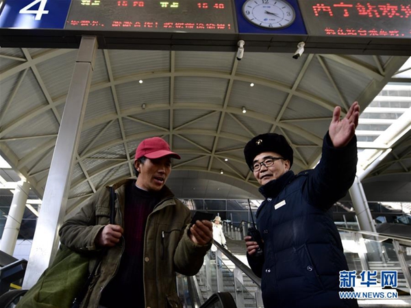 1月16日,李海云在西寧站引導旅客乘車。新華社發(fā)(張龍 攝)