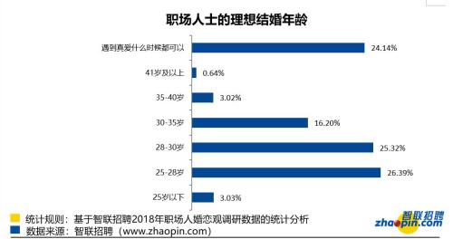 其中也有不少職場人對婚姻的年齡沒有執(zhí)念,認為真愛才是結婚的前提,24.14%的職場人認為只要遇到真愛隨時都可以結婚。