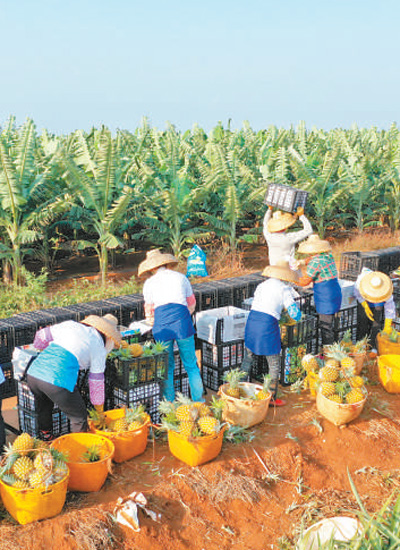 廣東湛江市徐聞縣盛產(chǎn)菠蘿,種植面積達(dá)35萬畝,年產(chǎn)量近50萬噸。春節(jié)臨近,菠蘿開始大量上市。圖為村民在田間將菠蘿打包裝車,準(zhǔn)備銷往全國各地。羅艾樺 陳北跑攝影報道
