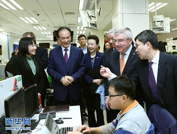 1月30日,新華社社長(zhǎng)蔡名照在北京會(huì)見國際奧委會(huì)主席巴赫。這是蔡名照陪同巴赫參觀新華社新聞信息發(fā)稿中心。新華社記者 鞠鵬 攝