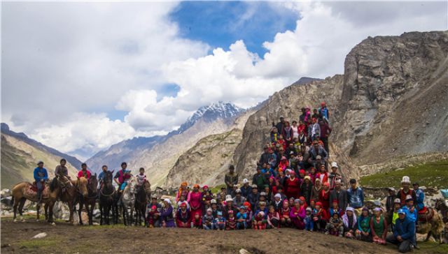2017年7月21日,喀拉塔什其木干村村民在夏牧場(chǎng)合影。(新華社記者江文耀攝·2017年)