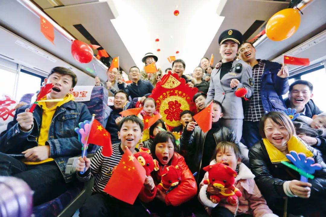 2019-02-03,江西省南昌市。D6503次列車上,列車乘務(wù)人員為了讓旅客返鄉(xiāng)旅程體驗更美好,精心布置車廂,為旅客派發(fā)福袋、糖果并合影留念。作者:嗯叮
