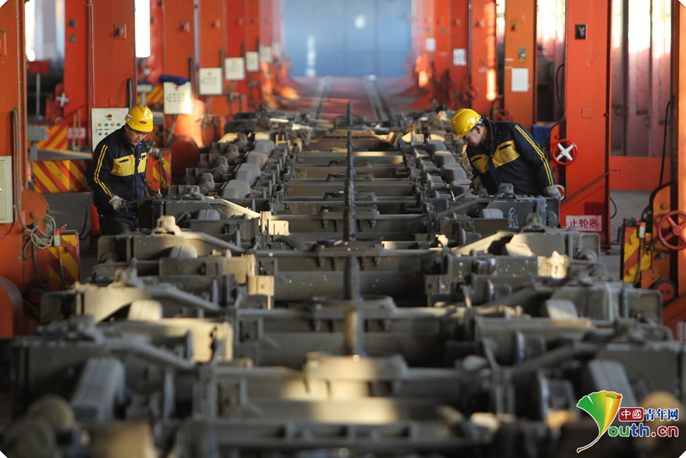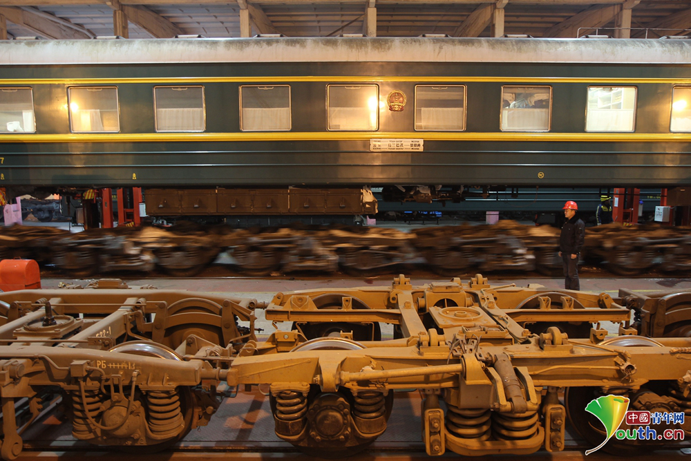 康亞斌和同事們所在的聯(lián)運(yùn)檢修車間擔(dān)負(fù)著北京至烏蘭巴托、北京至莫斯科以及呼和浩特至烏蘭巴托等6趟國際旅客列車換輪任務(wù),還要對(duì)這些車輛重要部件進(jìn)行定期檢修。
