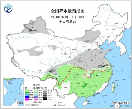 圖2 全國降水量預(yù)報圖(2月9日08時-10日08時)