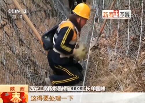 西安工務段漢中橋隧車間鄠邑橋隧工區(qū)工長 單國峰:這得要處理一下,滑落下來了,到了第一道網(wǎng),就要把它們?nèi)壳謇沓鋈ィ乐節(jié)L落到線路上去。找一個平一點的臺子,把它碼好、堆好,防止?jié)L落,有條件的情況下挖個坑給它掩埋了。