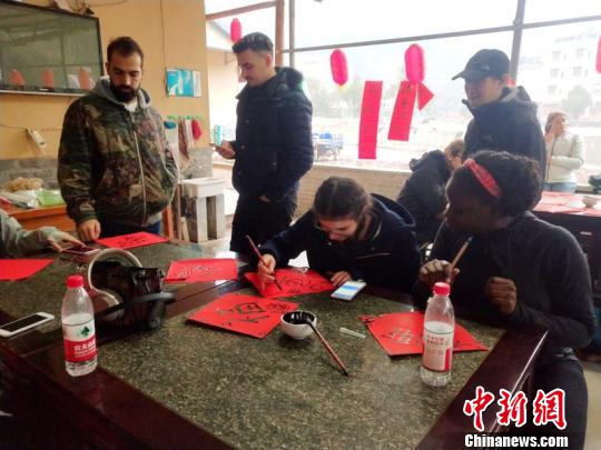 外國(guó)游客學(xué)寫(xiě)春聯(lián) 武義提供