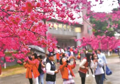 華南農(nóng)業(yè)大學(xué)內(nèi)的櫻花盛開(kāi),引來(lái)不少市民賞花拍花。記者廖雪明 攝