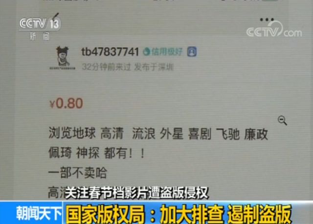 大年初一,多部不同類型和題材的國產(chǎn)影片集中上映,吸引了不少觀眾走進(jìn)影院。以電影《流浪地球》為例,憑借觀眾口碑,截至15日下午,該片票房已突破32億元,刷新了國產(chǎn)電影的多項票房紀(jì)錄。不過《流浪地球》上映沒幾天,該片的盜版資源就開始通過微信朋友圈和微博等渠道在互聯(lián)網(wǎng)上傳播。甚至有人通過微商公然叫賣包含《流浪地球》在內(nèi)的多部院線影片的盜版資源,不僅聲稱畫質(zhì)“高清完整”,單部影片售價低至1元不到,打包購買還能享受優(yōu)惠。