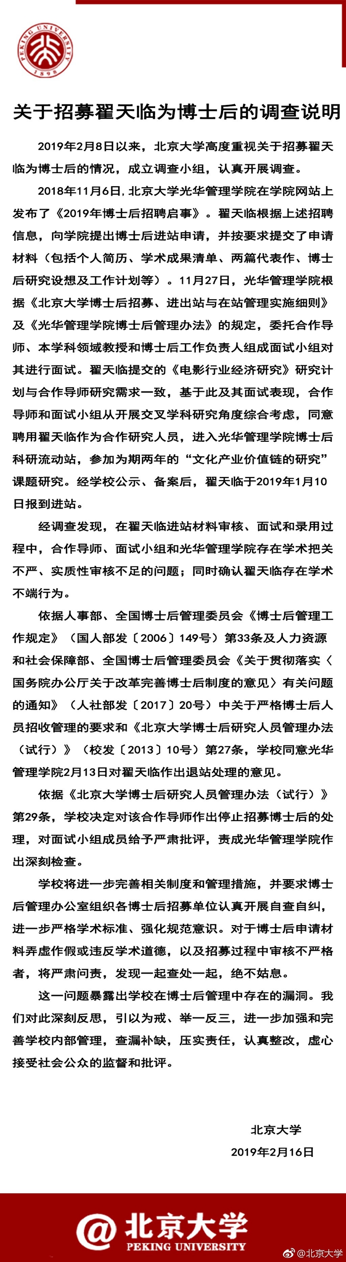 2月16日北京大學官方微博發(fā)布關于招募翟天臨為博士后的調查說明。