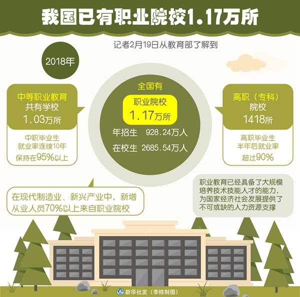 新華社北京2月19日電(記者胡浩)記者19日從教育部了解到,2018年,全國有職業(yè)院校1.17萬所,年招生928.24萬人,在校生2685.54萬人。職業(yè)教育已經(jīng)具備了大規(guī)模培養(yǎng)技術(shù)技能人才的能力,為國家經(jīng)濟(jì)社會發(fā)展提供了不可或缺的人力資源支撐。