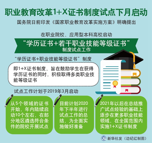 “職教20條”提出,從2019年開始,在職業(yè)院校、應(yīng)用型本科高校啟動(dòng)“學(xué)歷證書+若干職業(yè)技能等級證書”制度試點(diǎn)(以下稱1+X證書制度試點(diǎn))工作。試點(diǎn)工作要進(jìn)一步發(fā)揮好學(xué)歷證書作用,夯實(shí)學(xué)生可持續(xù)發(fā)展基礎(chǔ),鼓勵(lì)職業(yè)院校學(xué)生在獲得學(xué)歷證書的同時(shí),積極取得多類職業(yè)技能等級證書,提高就業(yè)創(chuàng)業(yè)本領(lǐng),緩解結(jié)構(gòu)性就業(yè)矛盾。