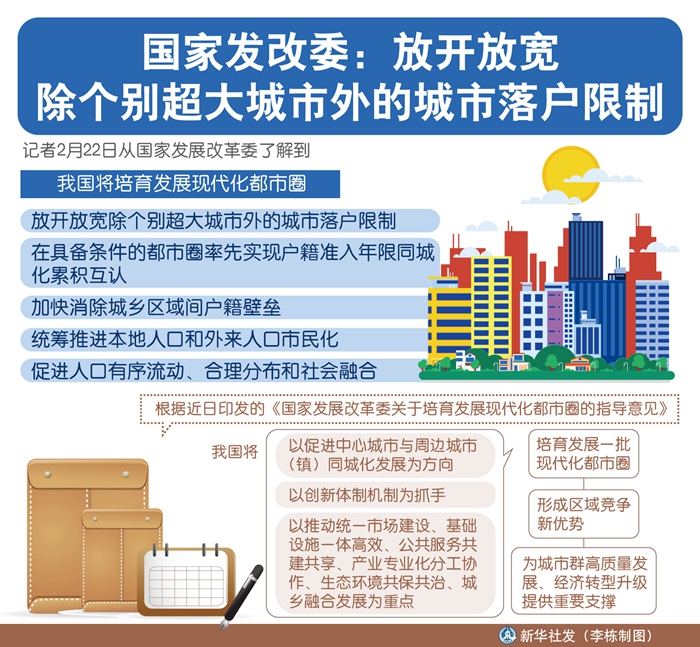 新華社北京2月22日電(安蓓、齊琪)記者22日從國家發(fā)展改革委了解到,我國將培育發(fā)展現(xiàn)代化都市圈。放開放寬除個(gè)別超大城市外的城市落戶限制,在具備條件的都市圈率先實(shí)現(xiàn)戶籍準(zhǔn)入年限同城化累積互認(rèn),加快消除城鄉(xiāng)區(qū)域間戶籍壁壘,統(tǒng)籌推進(jìn)本地人口和外來人口市民化,促進(jìn)人口有序流動、合理分布和社會融合。