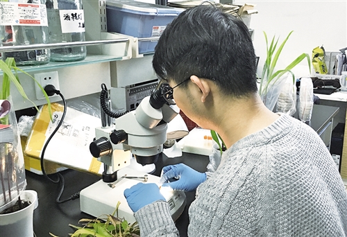 一名學(xué)生在實(shí)驗(yàn)室對玉米苗進(jìn)行真菌樣本采集。 記者 沈慧 攝