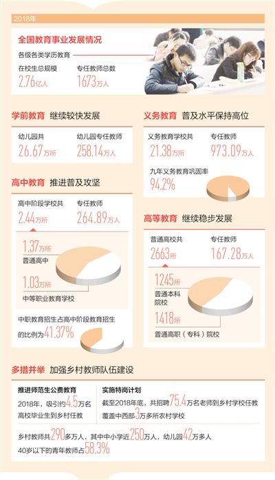 2018年,我國(guó)各級(jí)各類教育均取得較大成就。學(xué)前教育快速發(fā)展,九年義務(wù)教育繼續(xù)鞏固,大班額、超大班額大幅下降,絕大多數(shù)義務(wù)教育學(xué)校達(dá)到辦學(xué)底線要求,偏遠(yuǎn)山區(qū)教學(xué)點(diǎn)變得小而美、小而全,貧困地區(qū)教師隊(duì)伍煥發(fā)新活力,高考綜合改革試點(diǎn)各地因地制宜制定方案……教育改革發(fā)展的各項(xiàng)工作正蹄疾步穩(wěn)、有序推進(jìn)。