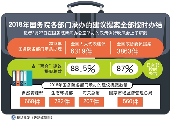 新華社北京2月27日電(胡璐、張涵)2018年,國(guó)務(wù)院各部門(mén)牽頭辦理全國(guó)人大代表建議6319件,全國(guó)政協(xié)委員提案3863件,分別占“兩會(huì)”建議提案總數(shù)的88.5%和87%,已全部按時(shí)辦結(jié)。