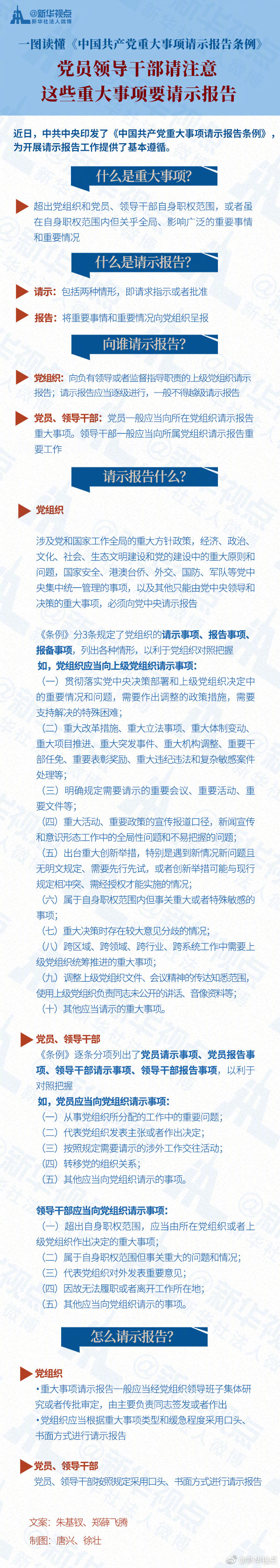 28日,中共中央印發(fā)的《中國共產(chǎn)黨重大事項請示報告條例》全文公布,為開展黨內(nèi)請示報告工作提供了基本遵循。黨組織、黨員、領(lǐng)導(dǎo)干部的哪些事項需要請示報告?向誰請示報告?怎么請示報告?一圖讀懂