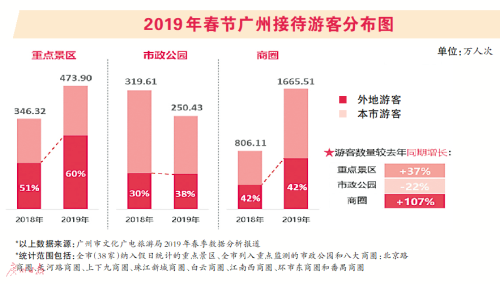 2019年春節(jié),廣州創(chuàng)下游客接待量和旅游業(yè)總收入“雙新高”,共接待旅客1696.27萬人次,較2018年同期增長8.66%,高于北京的811.70萬人次、上海的509.20萬人次,居一線城市首位,分別是北京的兩倍和上海的三倍;旅游業(yè)創(chuàng)收122億元,實現(xiàn)9.74%的增長,高于北京的81.85億元和上海的66.20億元,分別是北京的1.5倍和上海的1.8倍。