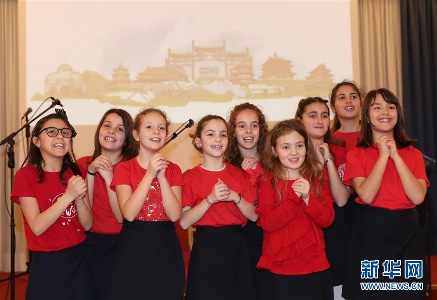 這是2019年2月8日,在意大利拉齊奧的古鎮(zhèn)蒂沃利,蒂沃利國立住讀學(xué)校的學(xué)生們在中國春節(jié)慶祝活動上給大家拜年。 新華社記者 程婷婷 攝
