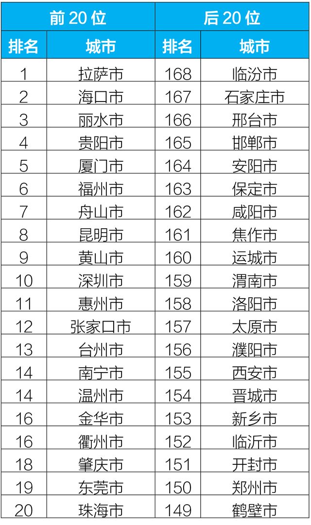 2019年1-2月,168個重點城市中臨汾、石家莊、邢臺市等20個城市空氣質量相對較差(從第168名到第149名);拉薩、???、麗水市等20個城市空氣質量相對較好。?
