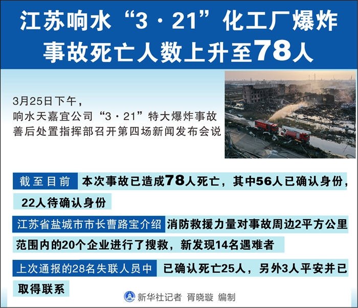 新華社響水3月25日電(記者朱國(guó)亮)25日下午,響水天嘉宜公司“3·21”特大爆炸事故善后處置指揮部召開第四場(chǎng)新聞發(fā)布會(huì)說(shuō),截至目前,本次事故死亡人數(shù)上升至78人。