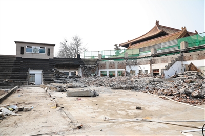 太廟曾是明清兩代皇帝祭奠祖先的家廟,因維護管理需要,曾在上世紀五六十年代建設(shè)過一些臨時建筑物,其中就有一處占地1600余平方米的廢棄看臺及附屬建筑物,由于歷史原因一直沒有將其拆除。經(jīng)多方協(xié)調(diào),3月20日上午東城城管東華門街道執(zhí)法一隊開始對該處有將近60年的“臨建”進行了拆除。