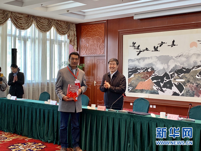 全國(guó)政協(xié)副主席、國(guó)家民委主任巴特爾(右一)向相關(guān)單位贈(zèng)書(shū)。新華網(wǎng) 王頔 攝