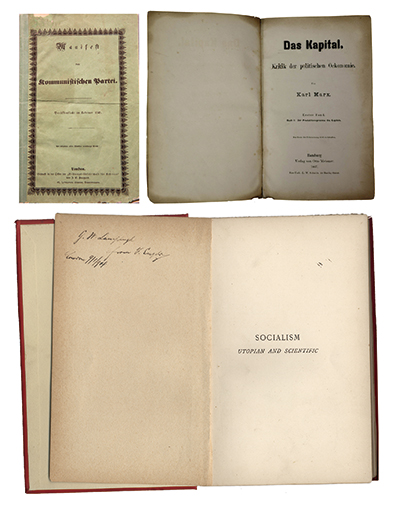 左上圖為1848年《共產(chǎn)黨宣言》德文第一版。右上圖為1867年《資本論》德文第1卷第一版。下圖為恩格斯的題字贈(zèng)書《社會(huì)主義從空想到科學(xué)的發(fā)展》,1892年英文版。 中央黨史和文獻(xiàn)研究院供圖