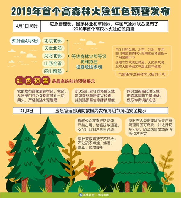“此次紅色預(yù)警是三部門綜合考慮氣象條件、林區(qū)物候及衛(wèi)星林火監(jiān)測、清明節(jié)期間祭掃影響等情況,經(jīng)過會商研判共同發(fā)布的?!敝袊鴼庀缶止矚庀蠓?wù)中心副首席楊曉丹說,自3月初以來,北京、河北、陜西、四川等地的森林火險等級一直居高不下,已持續(xù)近一個月;近期冷空氣活動頻發(fā)、大風(fēng)天氣多,北方大部分地區(qū)氣溫比往年偏高,氣象條件對森林防火極為不利。