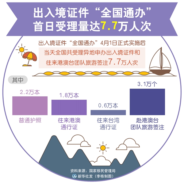 新華社北京4月2日電 記者2日從國(guó)家移民管理局獲悉,出入境證件“全國(guó)通辦”1日正式實(shí)施后,當(dāng)天全國(guó)共受理異地申辦出入境證件和往來(lái)港澳臺(tái)團(tuán)隊(duì)旅游簽注7.7萬(wàn)人次,其中普通護(hù)照2.2萬(wàn)本、往來(lái)港澳通行證1.8萬(wàn)本、往來(lái)臺(tái)灣通行證0.6萬(wàn)本、赴港澳臺(tái)團(tuán)隊(duì)旅游簽注3.1萬(wàn)個(gè)。