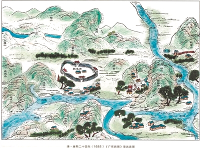 清代康熙年間的清遠(yuǎn)地圖, 用中國(guó)山水畫(huà)中的散點(diǎn)透視的技法繪制。