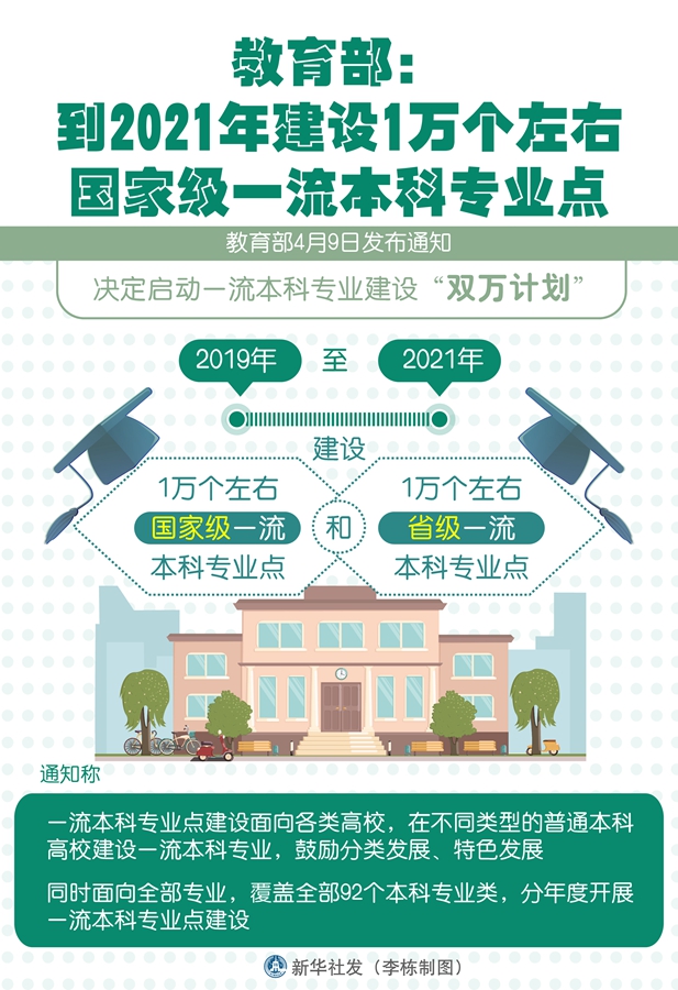 新華社北京4月9日電(記者施雨岑)教育部9日發(fā)布通知,決定啟動一流本科專業(yè)建設“雙萬計劃”,2019年至2021年建設1萬個左右國家級一流本科專業(yè)點和1萬個左右省級一流本科專業(yè)點。