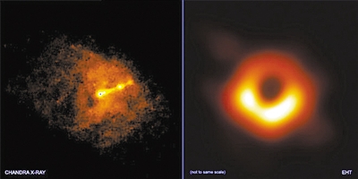 左圖 錢德拉X射線望遠(yuǎn)鏡與事件視界望遠(yuǎn)鏡同時(shí)拍攝的照片,顯示了M87星系中心黑洞的“相對(duì)論性噴流”。右圖 事件視界望遠(yuǎn)鏡拍攝的M87星系中心黑洞圖像。圖片來(lái)源:美國(guó)趣味科學(xué)網(wǎng)站