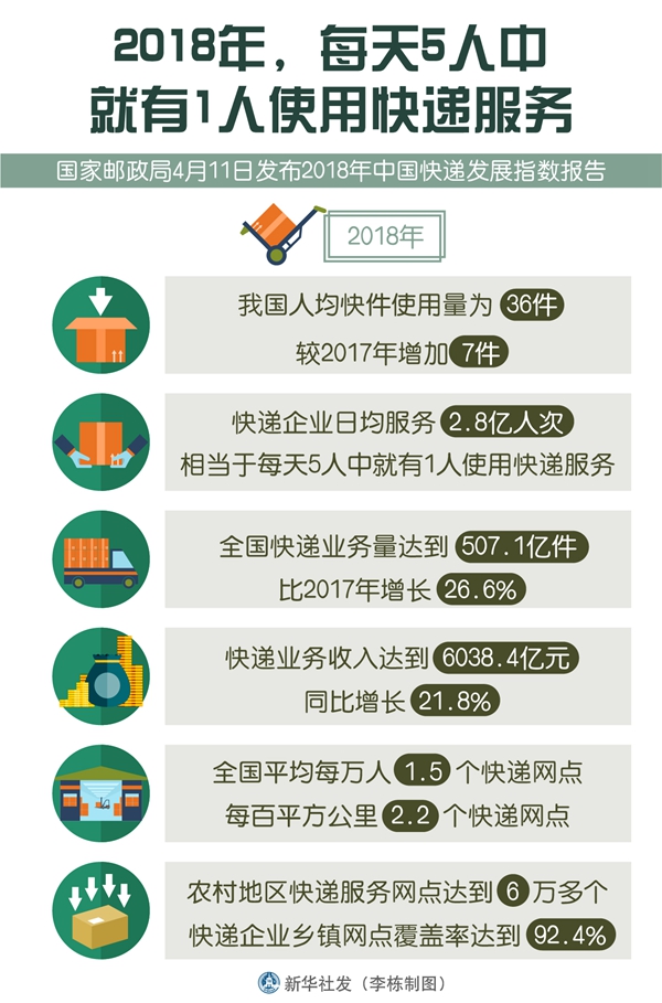 新華網北京4月12日電(記者 李志強)11日,國家郵政局發(fā)布《2018年中國快遞發(fā)展指數(shù)報告》(以下簡稱《報告》)?!秷蟾妗凤@示,2018年,中國快遞業(yè)務量超過美、日、歐發(fā)達經濟體之和,規(guī)模連續(xù)五年穩(wěn)居世界第一,成為全球快遞包裹市場發(fā)展的動力源和穩(wěn)定器。