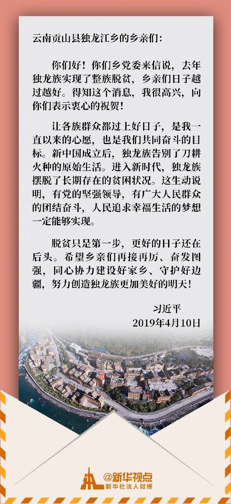 2018年,獨龍江鄉(xiāng)6個行政村整體脫貧,獨龍族實現(xiàn)整族脫貧。當?shù)厝罕娢朽l(xiāng)黨委給習(xí)近平總書記寫信,匯報獨龍族實現(xiàn)整族脫貧的喜訊,表達了繼續(xù)堅定信心跟黨走、為建設(shè)好家鄉(xiāng)同心奮斗的決心。