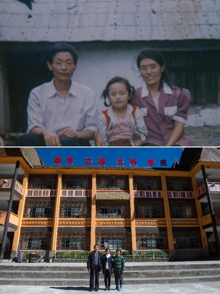 拼版照片,上圖:1993年在獨龍江鄉(xiāng)小學(xué)拍攝的獨龍族群眾高德生、高瓊先和黎英(從左到右)一家三口(資料照片);下圖:2016年11月23日在獨龍江鄉(xiāng)中心小學(xué)拍攝的獨龍族群眾高德生、高瓊先和黎英一家(從左到右)