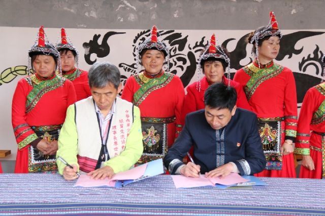 太源畬族鄉(xiāng)鄉(xiāng)長雷諄身(右)與中華兩岸少數(shù)民族文化經貿交流協(xié)會理事長廖世杰簽署兩岸少數(shù)民族交流合作備忘錄現(xiàn)場。(李娜 攝)
