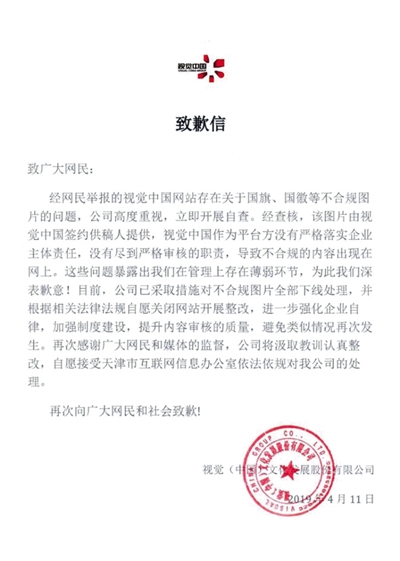 視覺中國致歉信。