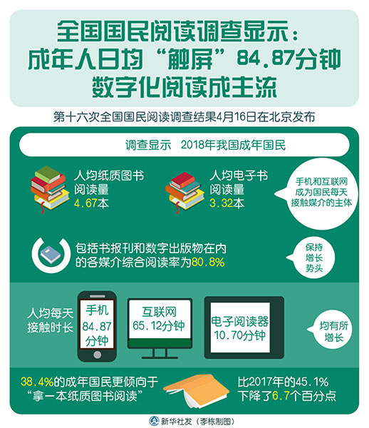 新華社北京4月16日電(記者 史競(jìng)男)第十六次全國(guó)國(guó)民閱讀調(diào)查結(jié)果16日在京發(fā)布。調(diào)查顯示,2018年我國(guó)成年國(guó)民人均紙質(zhì)圖書(shū)閱讀量為4.67本、電子書(shū)閱讀量為3.32本,手機(jī)和互聯(lián)網(wǎng)成為國(guó)民每天接觸媒介的主體,紙質(zhì)書(shū)報(bào)刊的閱讀時(shí)長(zhǎng)均有所減少。