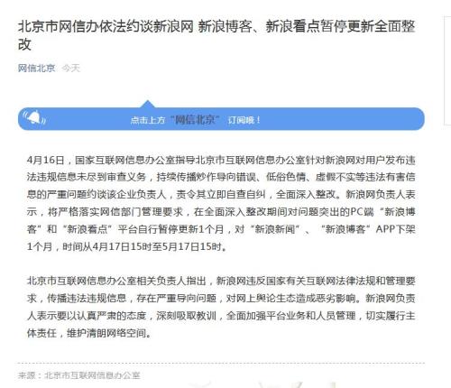 新浪網(wǎng)負(fù)責(zé)人表示,將嚴(yán)格落實(shí)網(wǎng)信部門管理要求,在全面深入整改期間對問題突出的PC端“新浪博客”和“新浪看點(diǎn)”平臺自行暫停更新1個(gè)月,對“新浪新聞”、“新浪博客”APP下架1個(gè)月,時(shí)間從4月17日15時(shí)至5月17日15時(shí)。