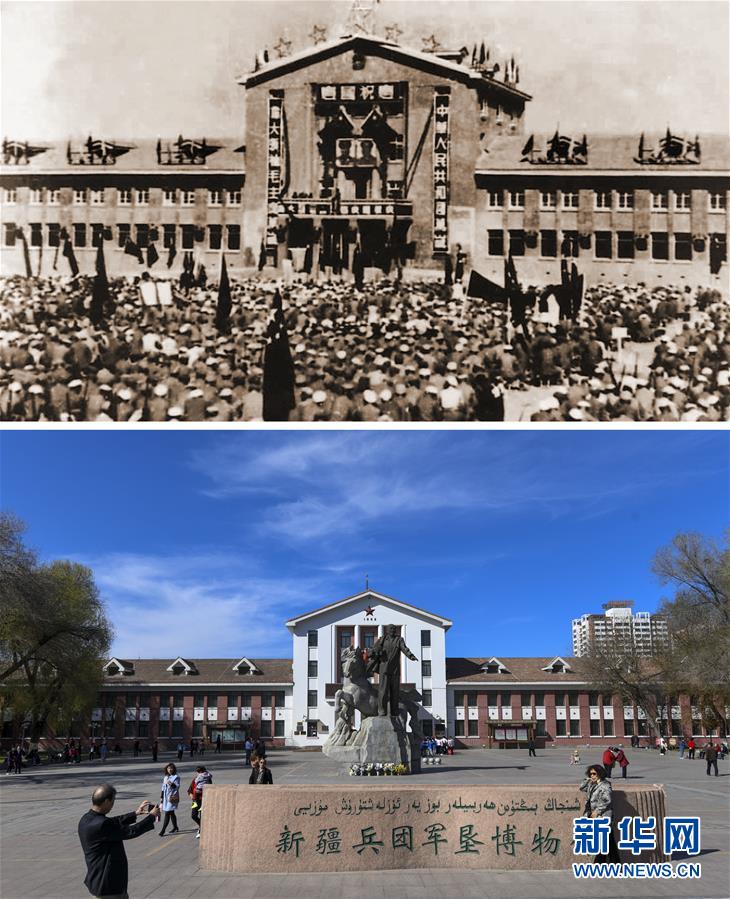 拼版照片:上圖為1952年10月拍攝的在石河子落成的中國人民解放軍第二十二兵團司令部機關(guān)辦公大樓(新疆兵團軍墾博物館提供);下圖為基于該建筑改建后的新疆兵團軍墾博物館(新華社記者王菲4月9日攝)。新華社發(fā)